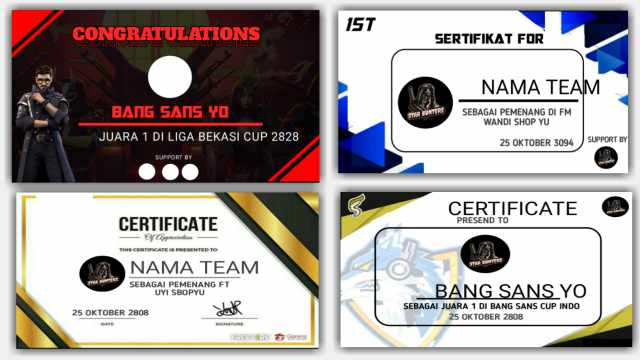 Berikut ini beberapa gambar contoh desain sertifikat penghargaan turnamen Free Fire.