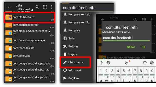 - Setelah sukses diekstrak, masuk dulu ke Android >> Data >> lalu ubah nama com.dts.freefireth menjadi com.dts.freefireth1. Hal ini bertujuan untuk nge-backup Data asli Free Fire jika suatu saat Anda ingin menghapus config FF yang dipasang.