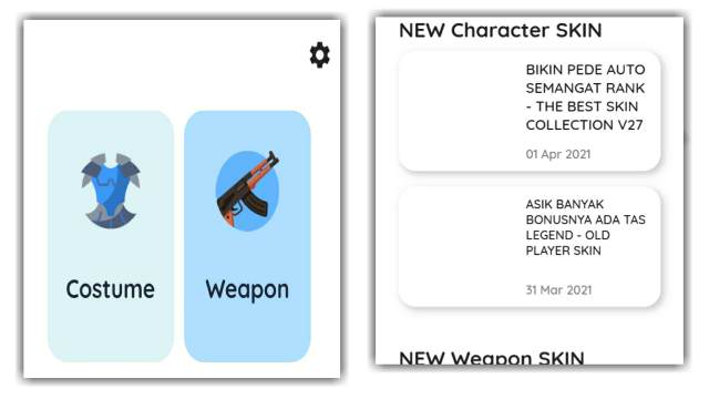 - Silahkan pilih Kostum atau Weapon. Jika Anda ingin config FF skin baju, maka pilih kostum. Jika ingin config skin senjata, maka pilih Weapon.