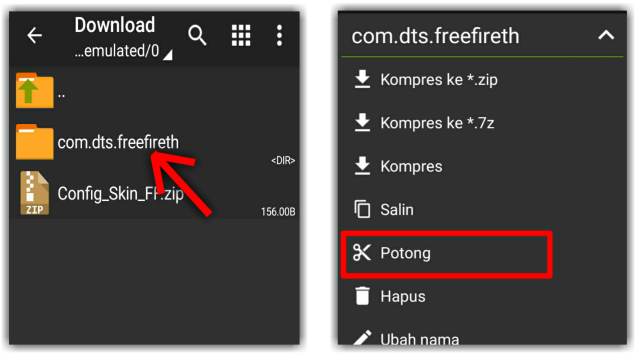 - Jika sudah, kembali ke config FF yang sudah diekstrak tadi, lalu Pindahkan folder com.dts.freefireth hasil ekstrakan tadi. Caranya, tap + tahan folder com.dts.freefireth tersebut >> pilih Potong.
