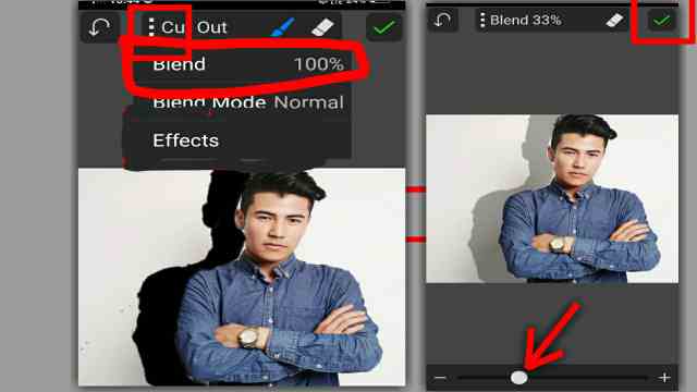 - Tak sampai disitu, tap lagi Titik Tiga lalu pilih Blend. Nah, silahkan atur Blend nya hingga warna hitamnya berkurang. Contoh 30%, Atur secukupnya saja.