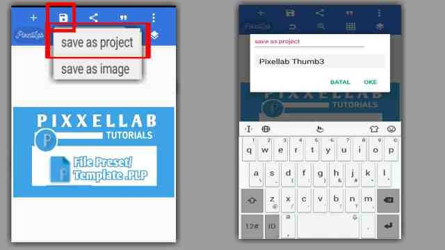 Kembali ke pembahasan, setelah editan atau desain grafis Kita sudah jadi dan ingin dijadikan preset/template .plp Pixellab, silahkan tap ikon yang berfungsi untuk menyimpan gambar yang terletak dibagian atas lalu pilih Save as Project. Kemudian beri nama Preset/Template tersebut. Contoh “Pixellab Thumb3“.