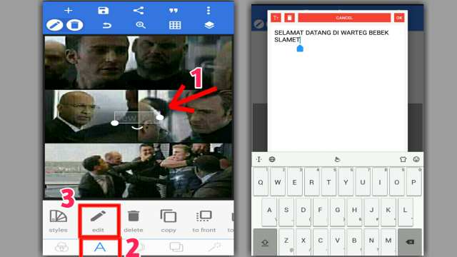 - Ulangi langkah penambahan dan pengeditan teks diatas jika meme yang Anda buat memerlukan beberapa teks. Biar cepat gandakan teks, tap teksnya lalu tap ikon Salin dan silahkan diedit. Jika ingin menghapus teks, tap teksnya lalu tap ikon Delete.