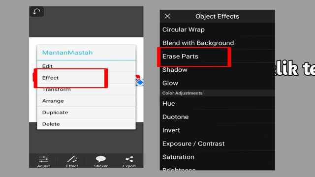 - Jika sudah, klik lagi teks tersebut lalu pilih Effect kemudian pilih Erase Parts.
