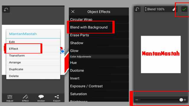 - Lalu klik lagi teks tersebut. Klik Effect lalu Blend With Background kemudian klik ikon Ceklist di kanan atas.