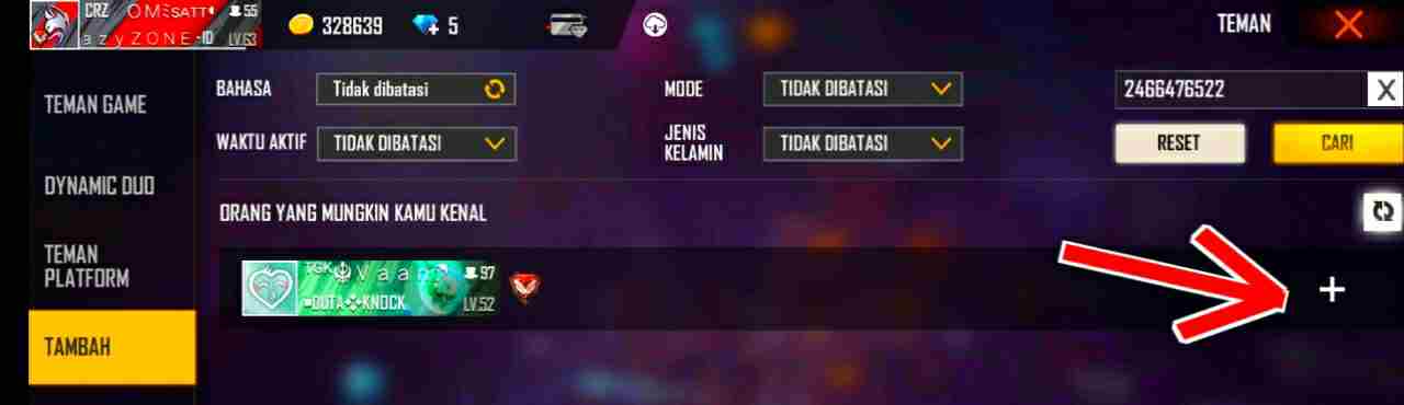 - Jika sudah, secara otomatis akan muncul akun pemain yang Anda Add. Nah, untuk meminta pertemanan FF, silahkan tap ikon Tambah (+).