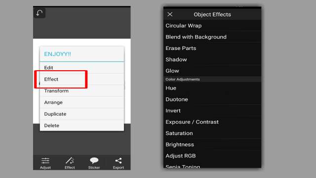 Jika teksnya di klik lalu pada bagian Effect terdapat beberapa fitur penyesuaian warna. Dan fitur yang tak kalah penting lagi yaitu :