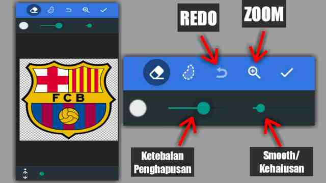 - Atur ketebalan atau ukuran erasernya dan Smooth nya juga. Lakukan Zoom juga agar menambah kerapihan dan ketelian saat menghapus. Setelah melakukan Zoom jangan lupa tap kembali ikon Zoom nya untuk memulai menghapus. Tap ikon Undo untuk mengembalikan perubahan terkahir.