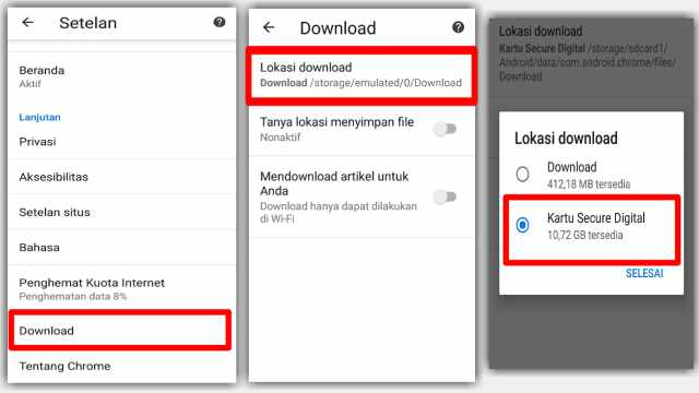 - Nah, silahkan pilih Lokasi Download kemudian pilih Kartu Secure Digital (kartu SD).