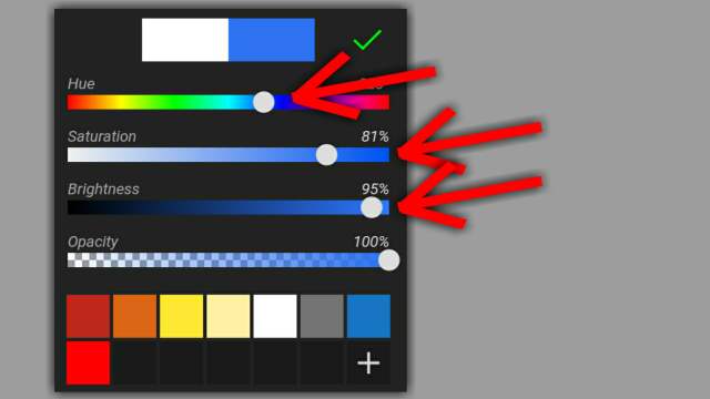 - Untuk memilih warnanya, geser lingkaran putih ke bagian warna yang Anda inginkan. Jika ingin warna biru, maka geser ke warna biru. Atur pula gelap-terang nya warna tersebut dengan memainkan Saturation dan Brightness.
