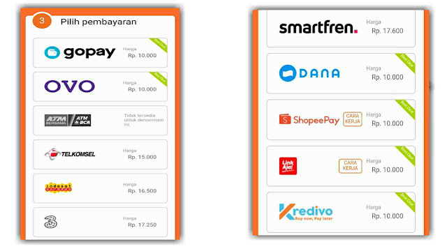- Pilih Metode Pembayaran. Kita bisa menggunakan pulsa Telkomsel, Indosat, Tri, Xl Axis, dan Smartfren. Kita bisa langsung melihat harganya. Harganya berbeda jika Kita menggunakan Pulsa, akan sedikit mahal. Berbeda jika Kita menggunakan E-Wallet seperti GoPay, Dana, dan Ovo.